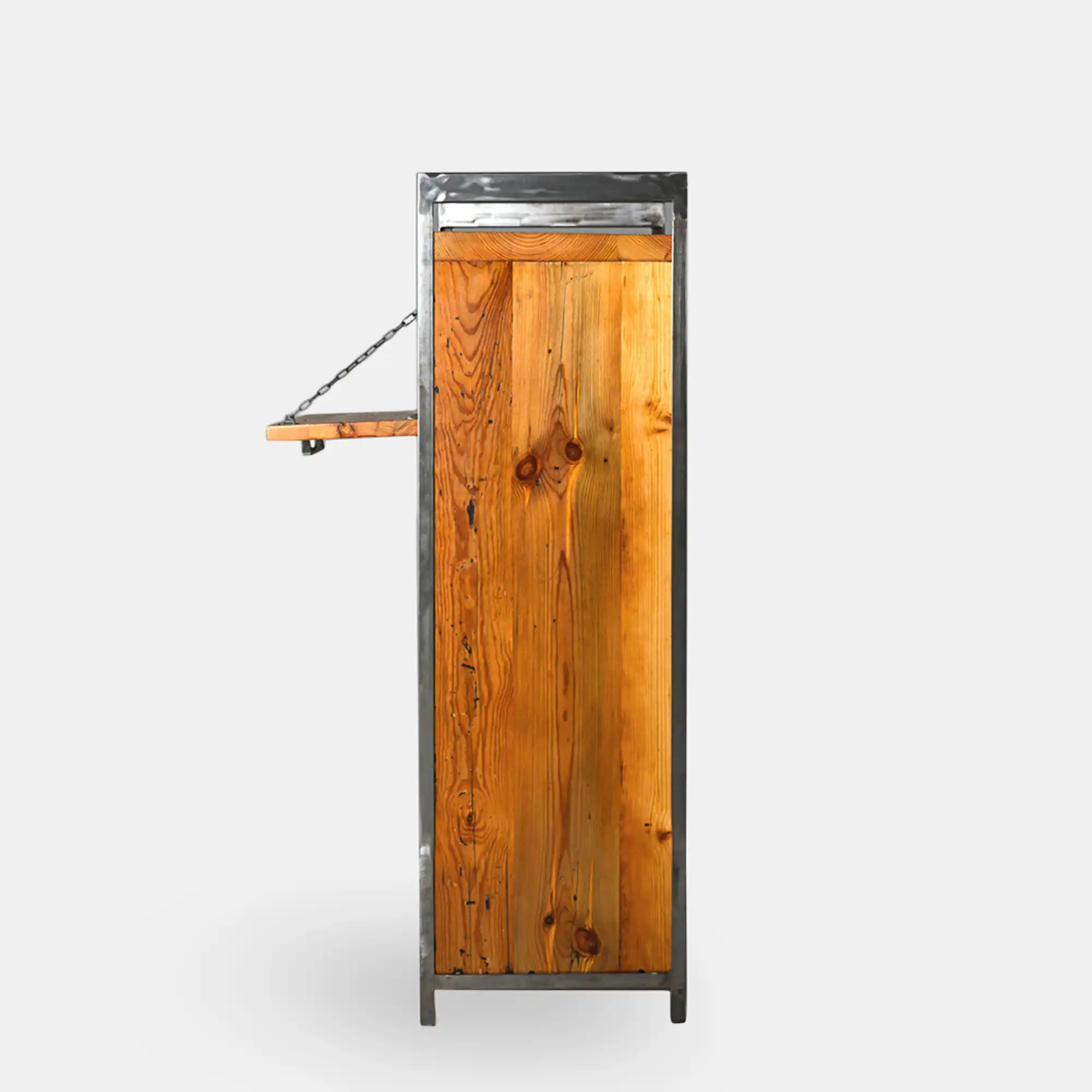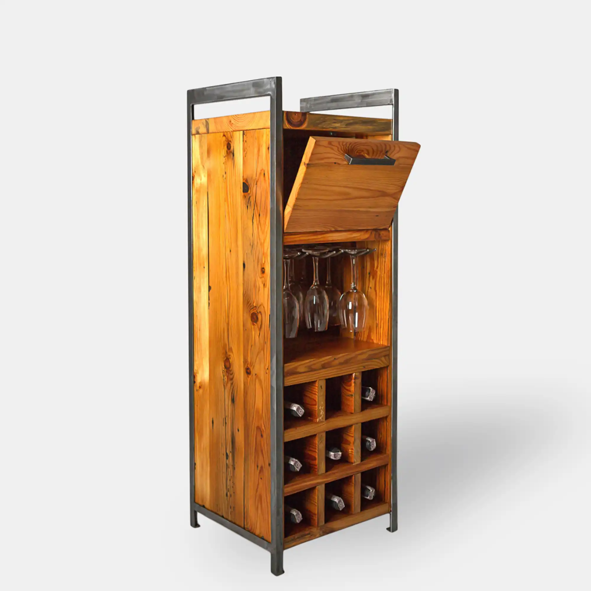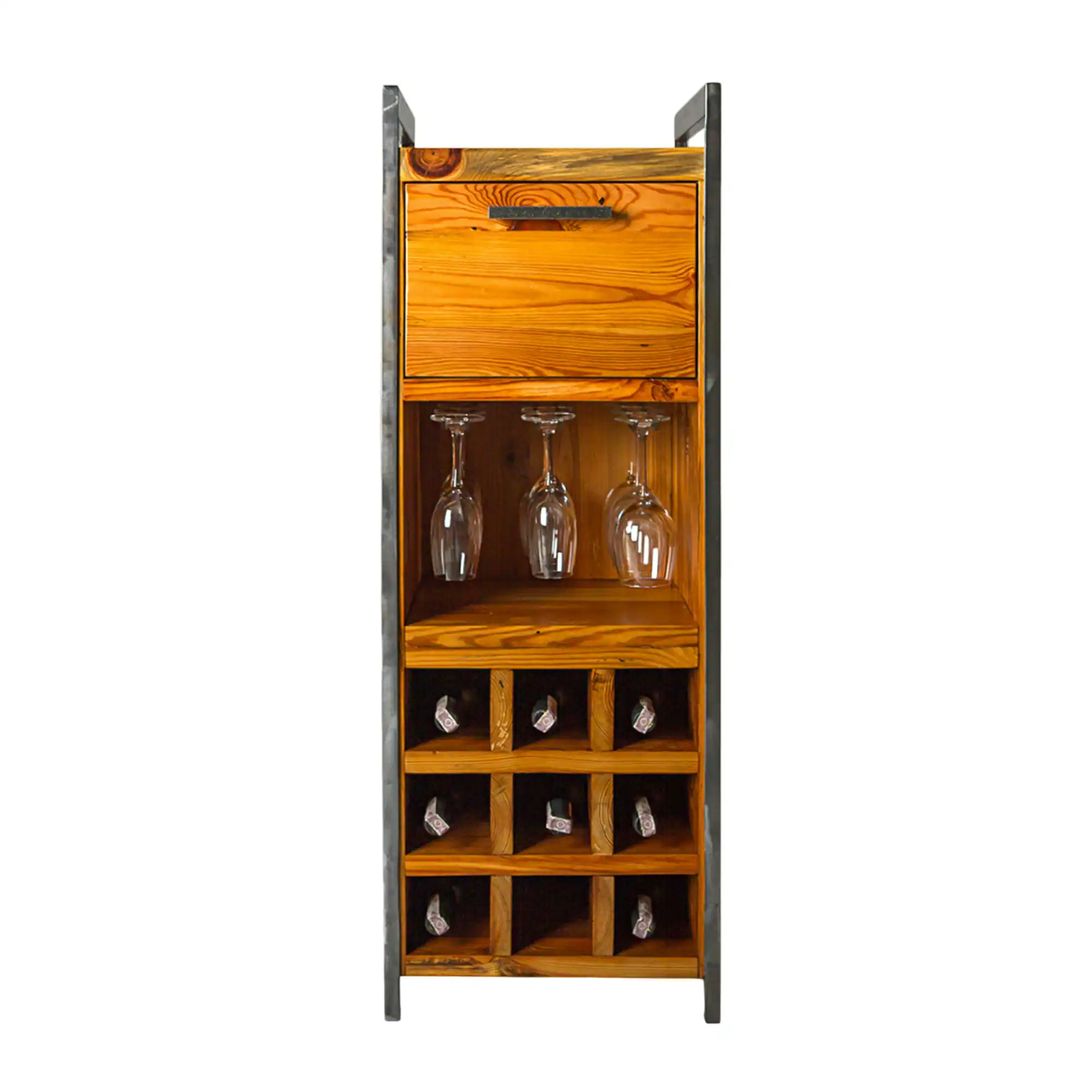 Nowoczesna szafka na alkohol, barek z drewna litego to doskonała propozycja barku producenta mebli do salonu, jadalni lub gabinetu. Oryginalny barek na wino wykonano ze starego drewna litego. Pomocnik barmański z pewnością idealnie wkomponowuje się we wnętrza w stylu nowoczesnym, industrialnym. Drewniany barek, szafka barowa zawiera 3 rzędy stojaków do przechowywania kieliszków do wina. Industrialny barek na alkohole jest solidny i wytrzymały, dzięki stalowej konstrukcji. Wygląda niczym szafa na alkohol co sprawia, że mebel jest jeszcze bardziej oryginalny. Nowoczesne barki drewniane z pewnością zapewnią miejsce na wszystkie kieliszki i alkohol w jadalni. Barek alkoholowy z drewna litego to elegancka i oryginalna propozycja wyposażenia wnętrza.
