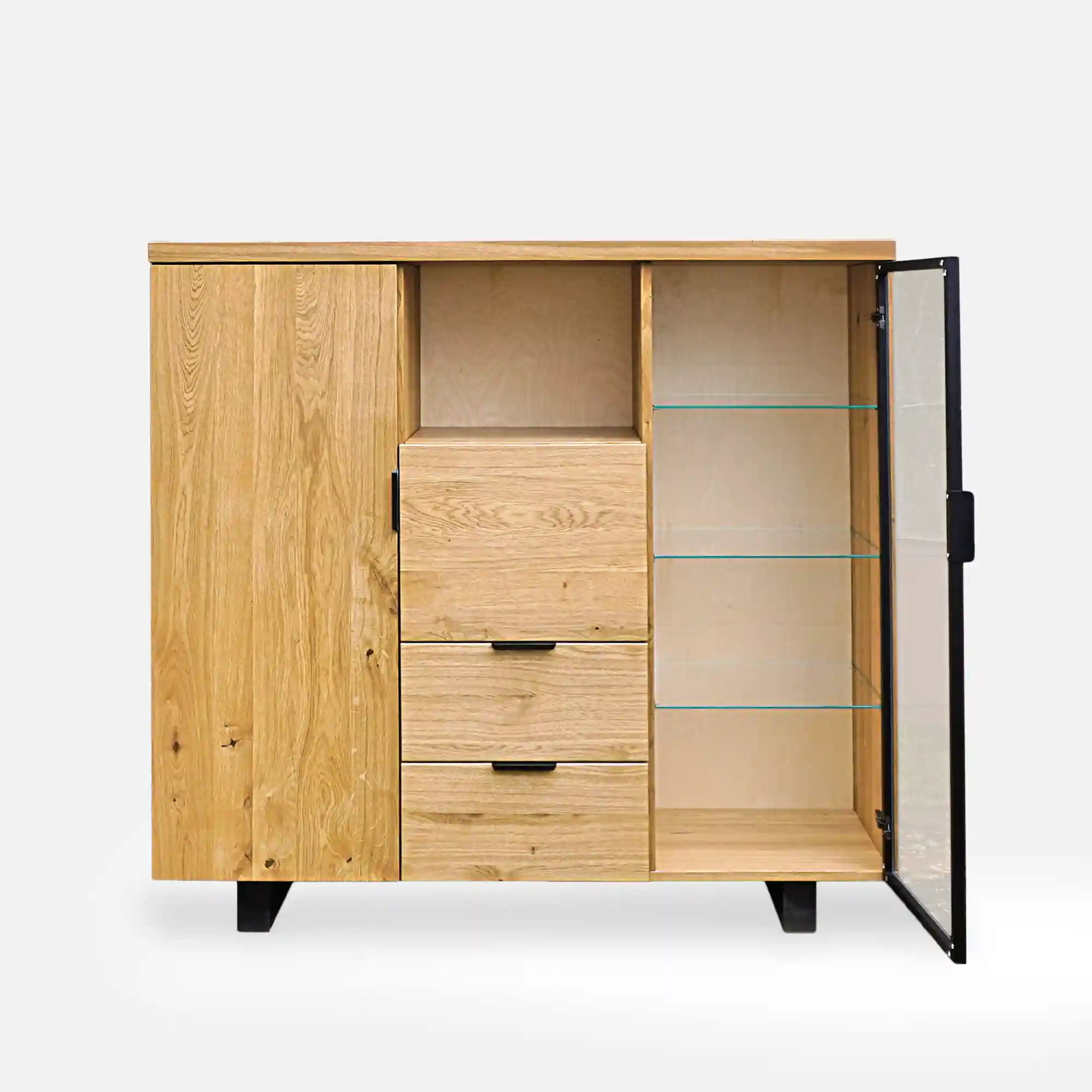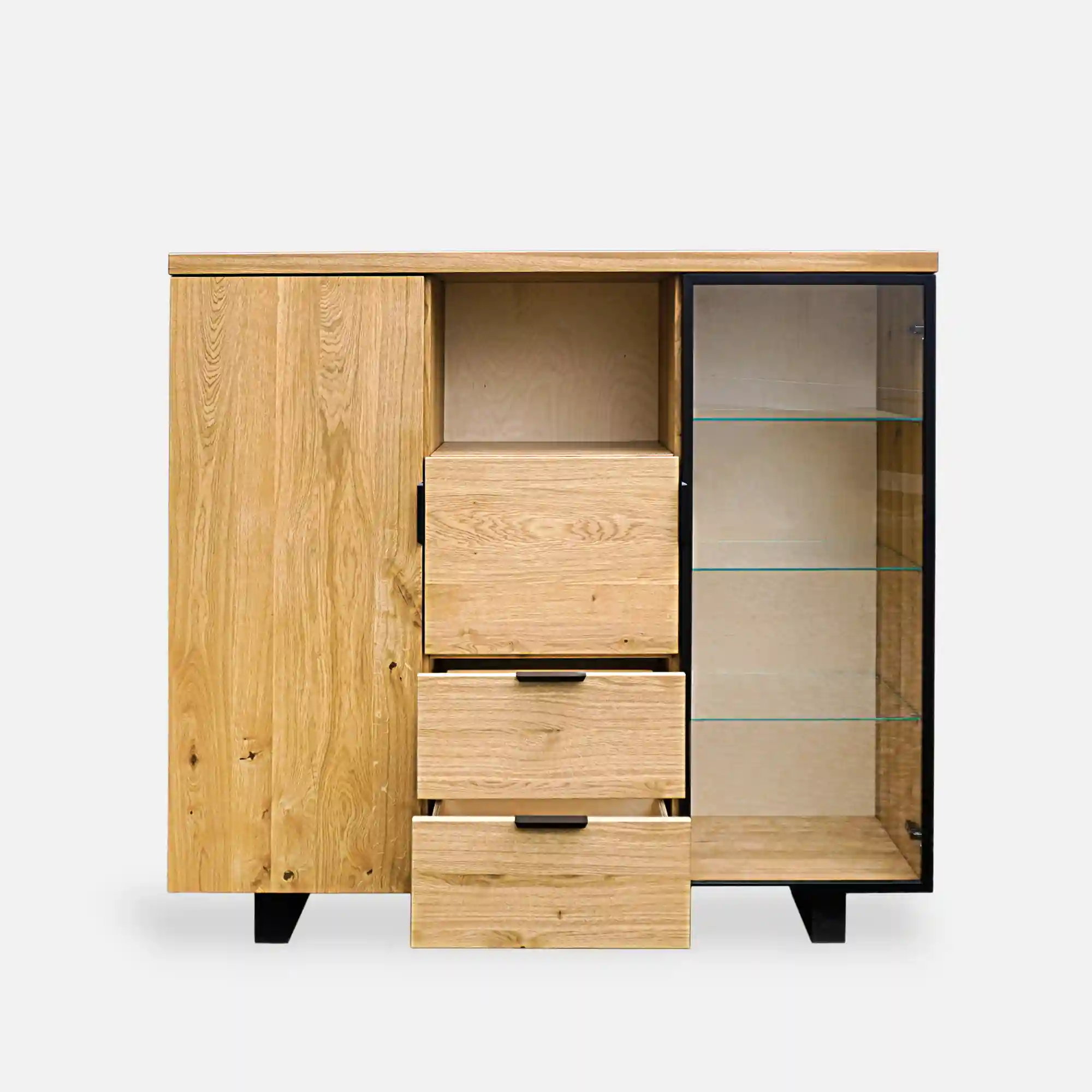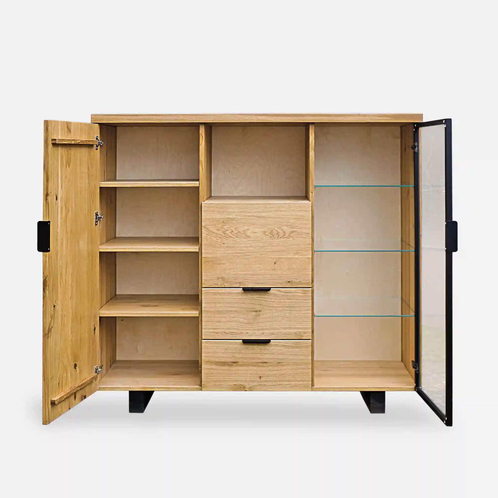 Nowoczesny barek dębowy na alkohole DELIO II to elegancki mebel, który dodaje wyrafinowanego uroku każdemu pomieszczeniu. Solidna konstrukcja z drewna dębowego jest starannie wykonana i wykończona tak, aby podkreślić naturalne piękno drewna. Barek na alkohol po obu stronach posiada szafki wyposażone w półki. Jedna szafka jest całkowicie wykonana z drewna dębowego, co umożliwia przechowywanie cięższych trunków. Natomiast druga ma szklane półki i drzwi z czarną metalową ramką. Witryna to dobry wybór do wyeksponowania wybranych butelek ulubionych alkoholi, a także pomieści dekoracyjne szkło. Nowoczesny barek na alkohol w części środkowej posiada jedną pojemną półkę oraz uchylną szafkę – co daje sporo miejsca do przechowywania. Pod nimi znajdują się szuflady, które są doskonałym miejscem na otwieracze do butelek i inne akcesoria barowe. Dzięki nim można łatwo utrzymać porządek i mieć wszystko pod ręką w momencie przygotowywania drinków. Barek na alkohol DELIO II podtrzymują solidne nóżki, dodające jeszcze więcej elegancji i stylu. Uchwyty także są wykonane z metalu, co sprawia, że wszystkie elementy tworzą spójną całość.