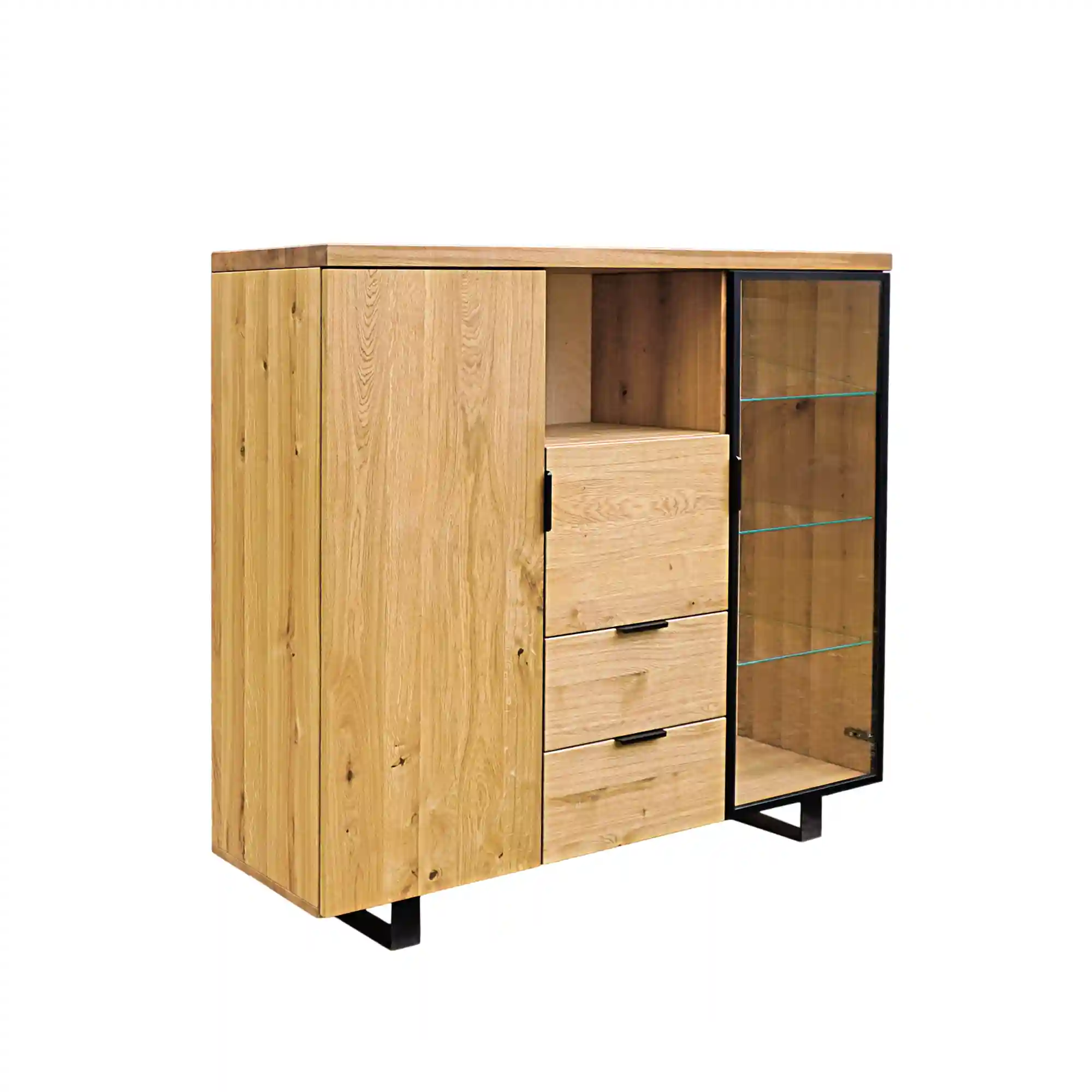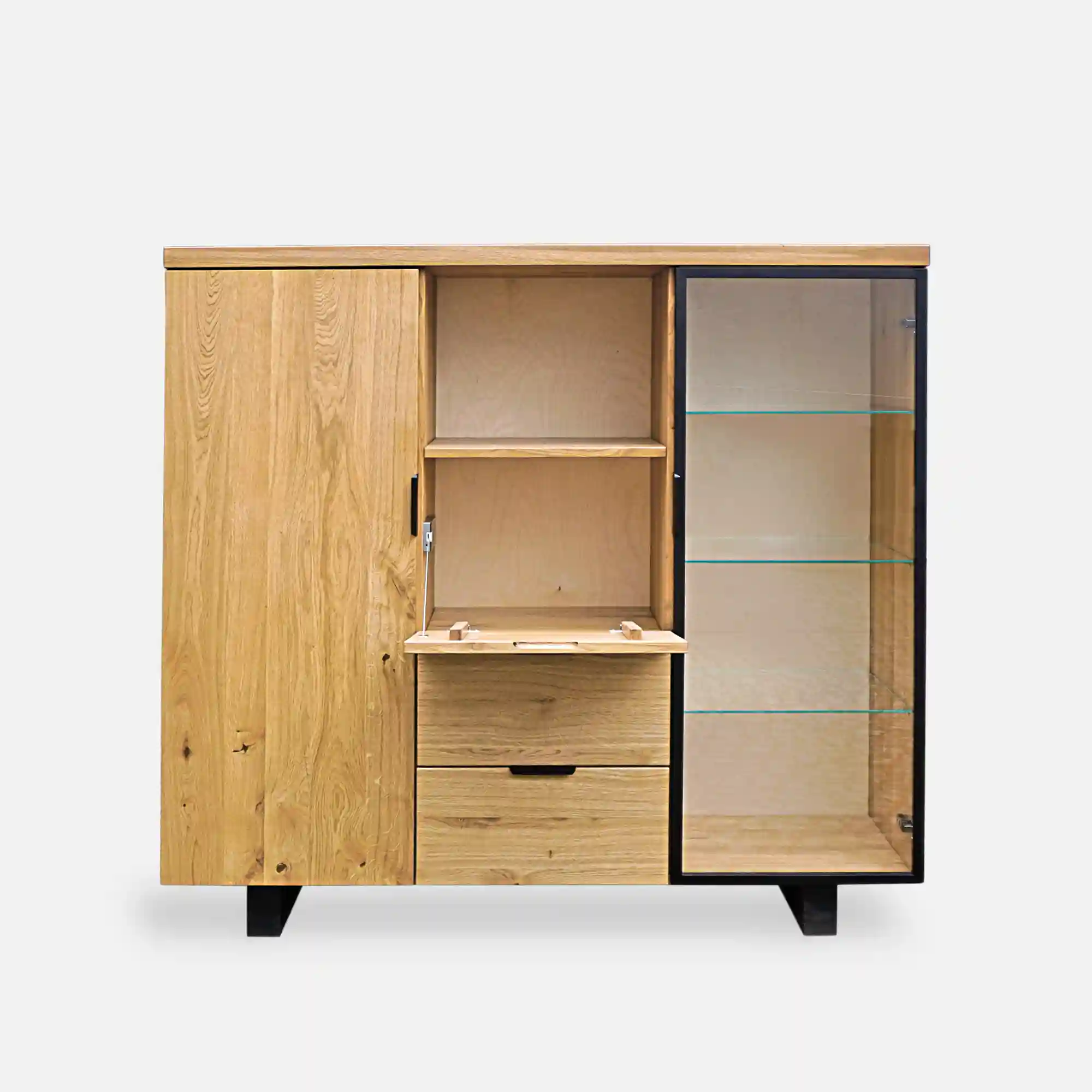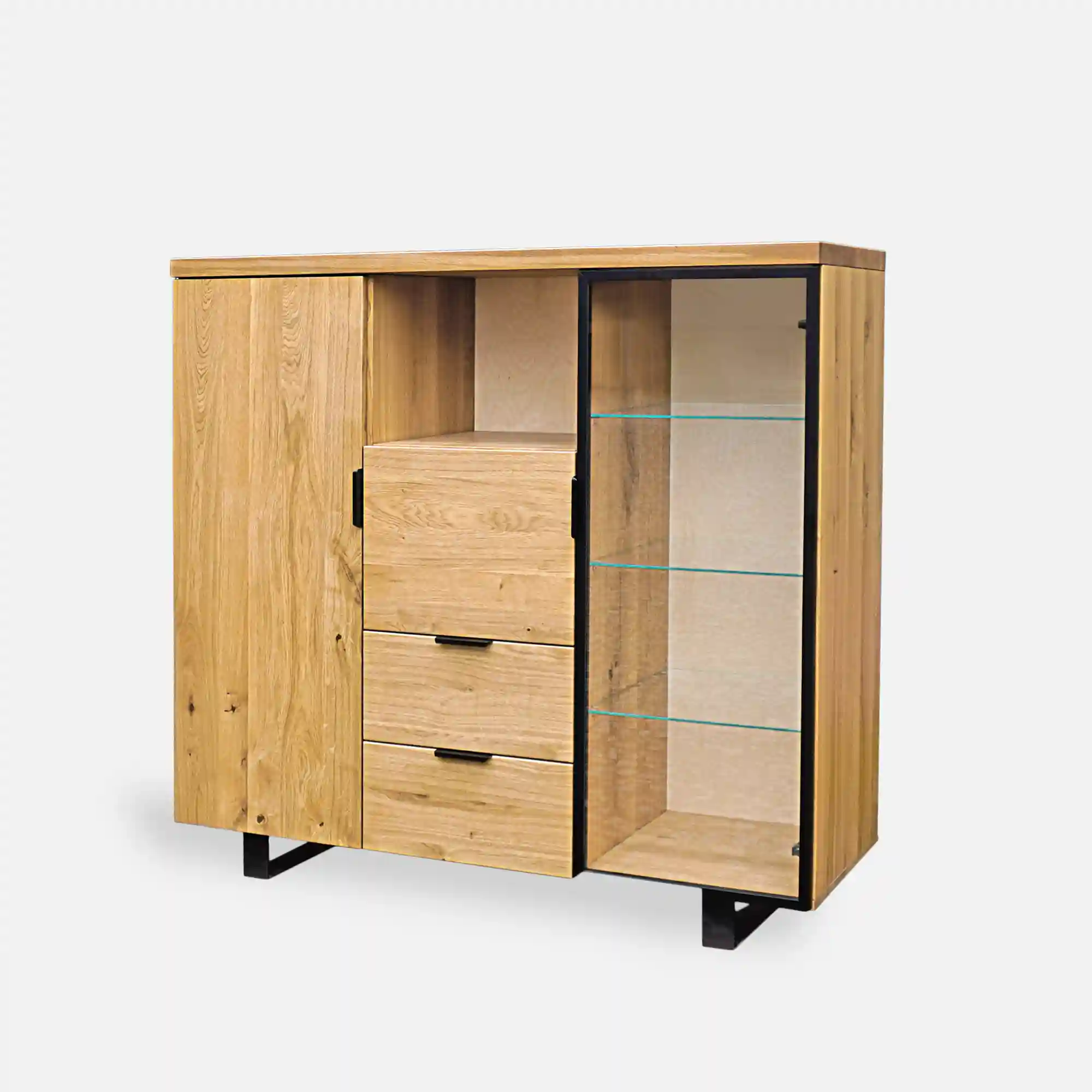 Nowoczesny barek dębowy na alkohole DELIO II to elegancki mebel, który dodaje wyrafinowanego uroku każdemu pomieszczeniu. Solidna konstrukcja z drewna dębowego jest starannie wykonana i wykończona tak, aby podkreślić naturalne piękno drewna. Barek na alkohol po obu stronach posiada szafki wyposażone w półki. Jedna szafka jest całkowicie wykonana z drewna dębowego, co umożliwia przechowywanie cięższych trunków. Natomiast druga ma szklane półki i drzwi z czarną metalową ramką. Witryna to dobry wybór do wyeksponowania wybranych butelek ulubionych alkoholi, a także pomieści dekoracyjne szkło. Nowoczesny barek na alkohol w części środkowej posiada jedną pojemną półkę oraz uchylną szafkę – co daje sporo miejsca do przechowywania. Pod nimi znajdują się szuflady, które są doskonałym miejscem na otwieracze do butelek i inne akcesoria barowe. Dzięki nim można łatwo utrzymać porządek i mieć wszystko pod ręką w momencie przygotowywania drinków. Barek na alkohol DELIO II podtrzymują solidne nóżki, dodające jeszcze więcej elegancji i stylu. Uchwyty także są wykonane z metalu, co sprawia, że wszystkie elementy tworzą spójną całość.