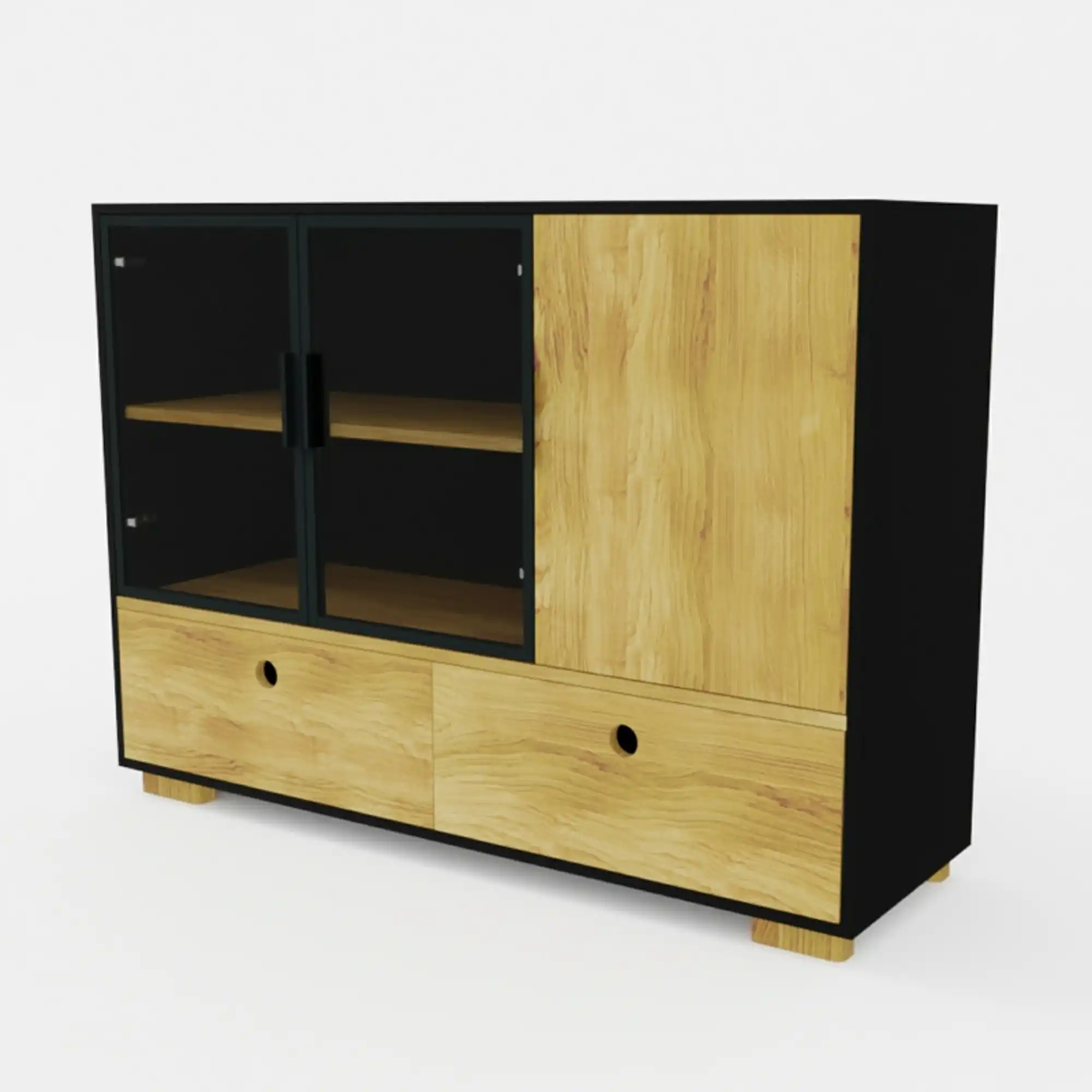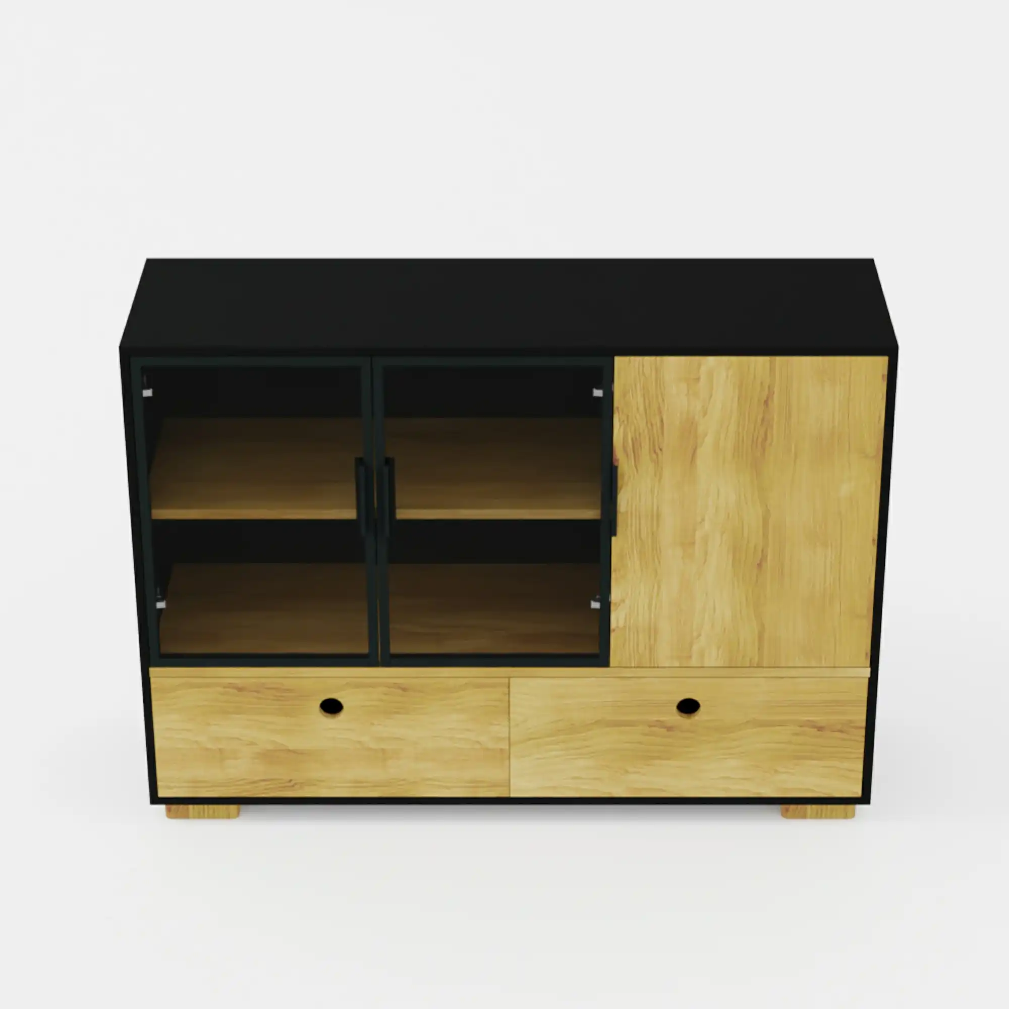Drewniana komoda nowoczesna to nowość w kolekcji mebli CARLA. Jest to gustowna propozycja mebla, który jest solidny i trwały a jednocześnie nowoczesny i stylowy. Komodę wykonano z litego drewna dębowego w połączeniu z czarną płytą laminowaną. Właśnie dzięki temu mebel zawdzięcza swą unikatowość, oryginalność oraz nowoczesny design. Nowoczesna komoda drewniana jest uniwersalna i bardzo praktyczna. Dębowa komoda posiada na dole dwie duże szuflady. Natomiast wyżej po prawej stronie posiada szafkę z półką w środku. Obok znajduje się duża szafka ze szklanymi drzwiami w czarnej metalowej ramce. W środku znajduje się dębowa półka. Dzięki temu drewniana komoda posiada dużo miejsca do przechowywania np. ubrań czy obrusów. Natomiast posiada również szklane fronty, za którymi mamy idealne miejsce do wyeksponowania zastawy, pamiątek czy zdjęć. Nowoczesne komody drewniane to bestsellery ostatnich lat, sprawdzą się doskonale w loftowych, industrialnych wnętrzach, jak również nowoczesnych i designerskich. Nowoczesna komoda z naturalnego litego drewna i czarnej płyty to świetna propozycja do salonu czy jadalni, jak również gabinetu czy biura. Jest to duża, pojemna, ale jednocześnie stylowa i designerska komoda, która przyciągnie uwagę każdego gościa.