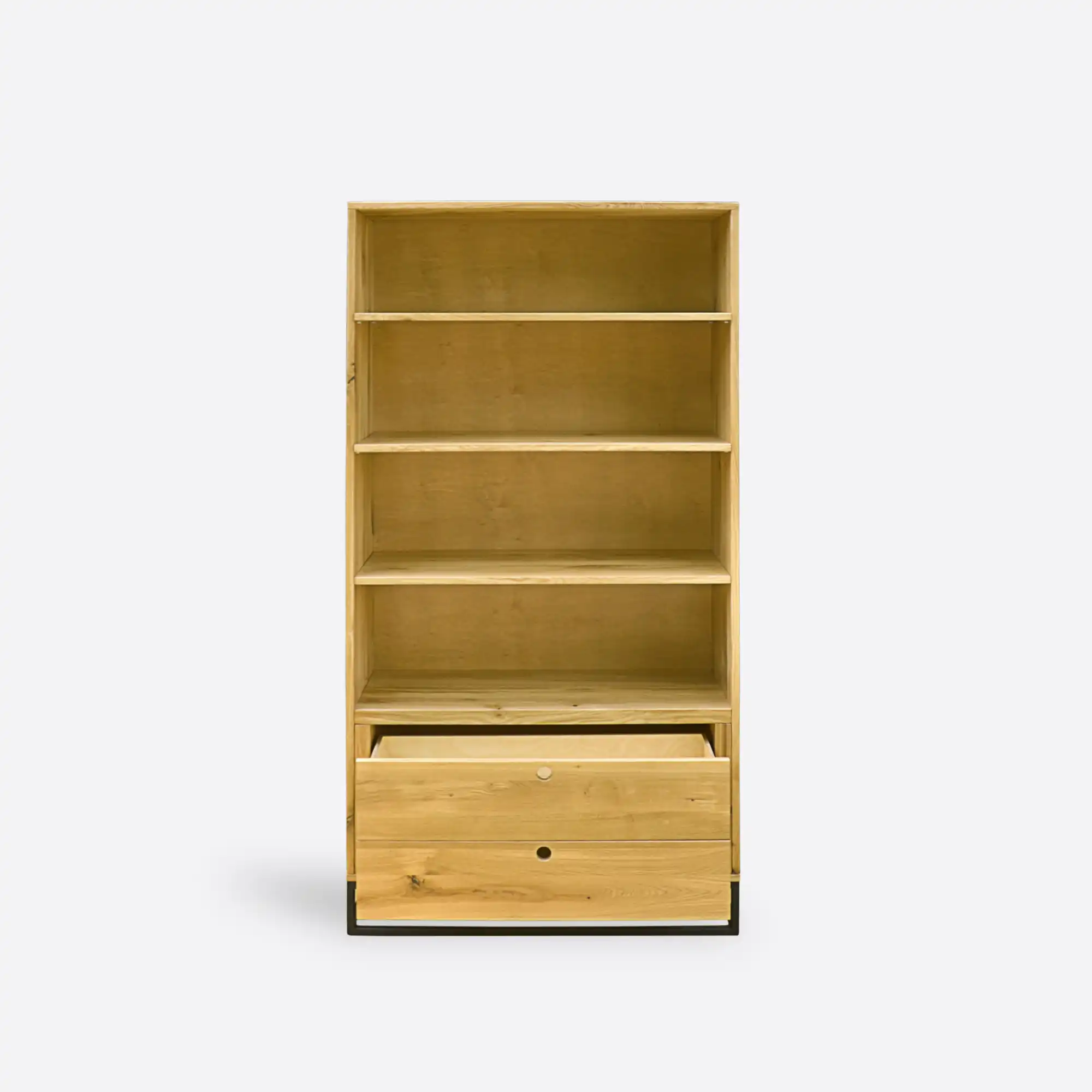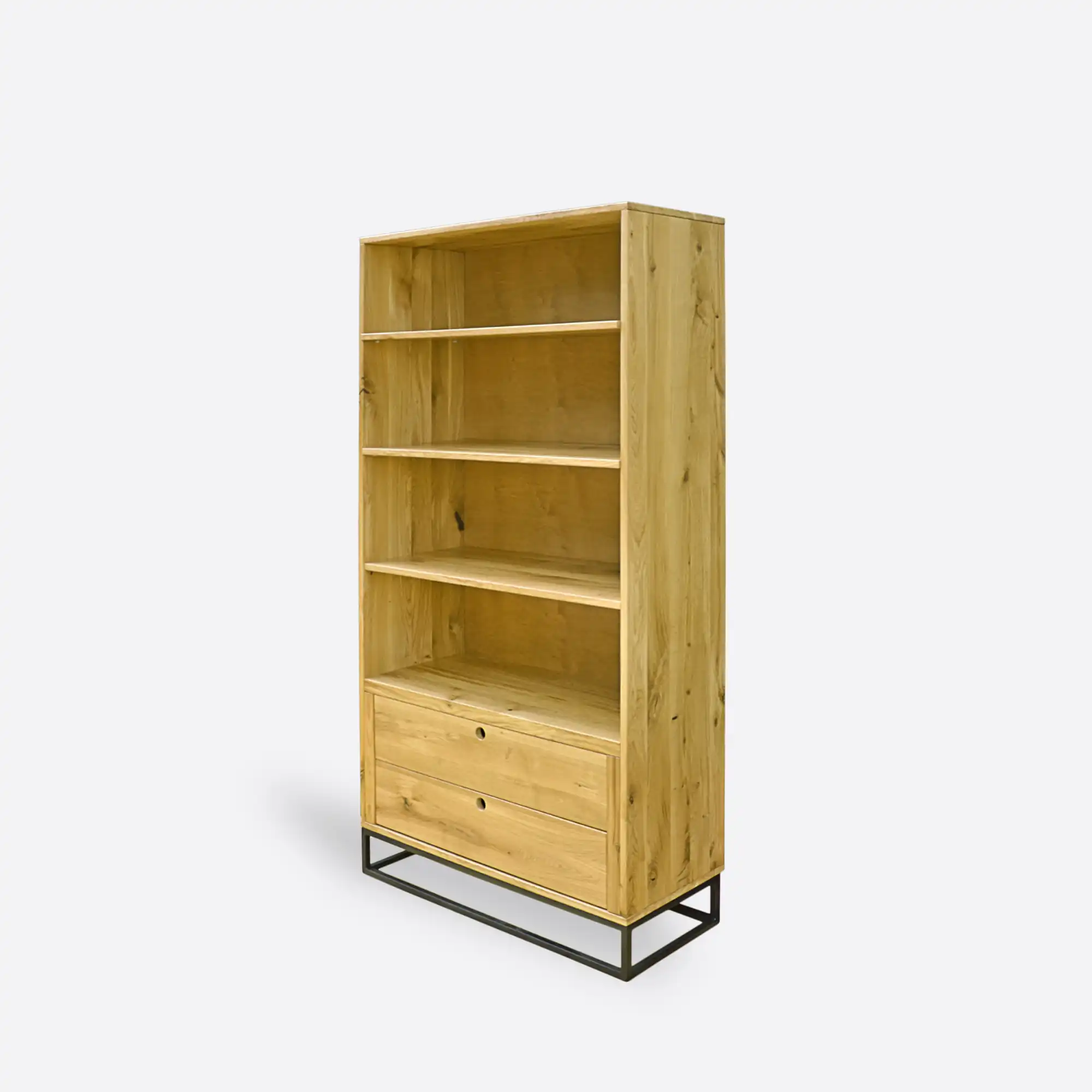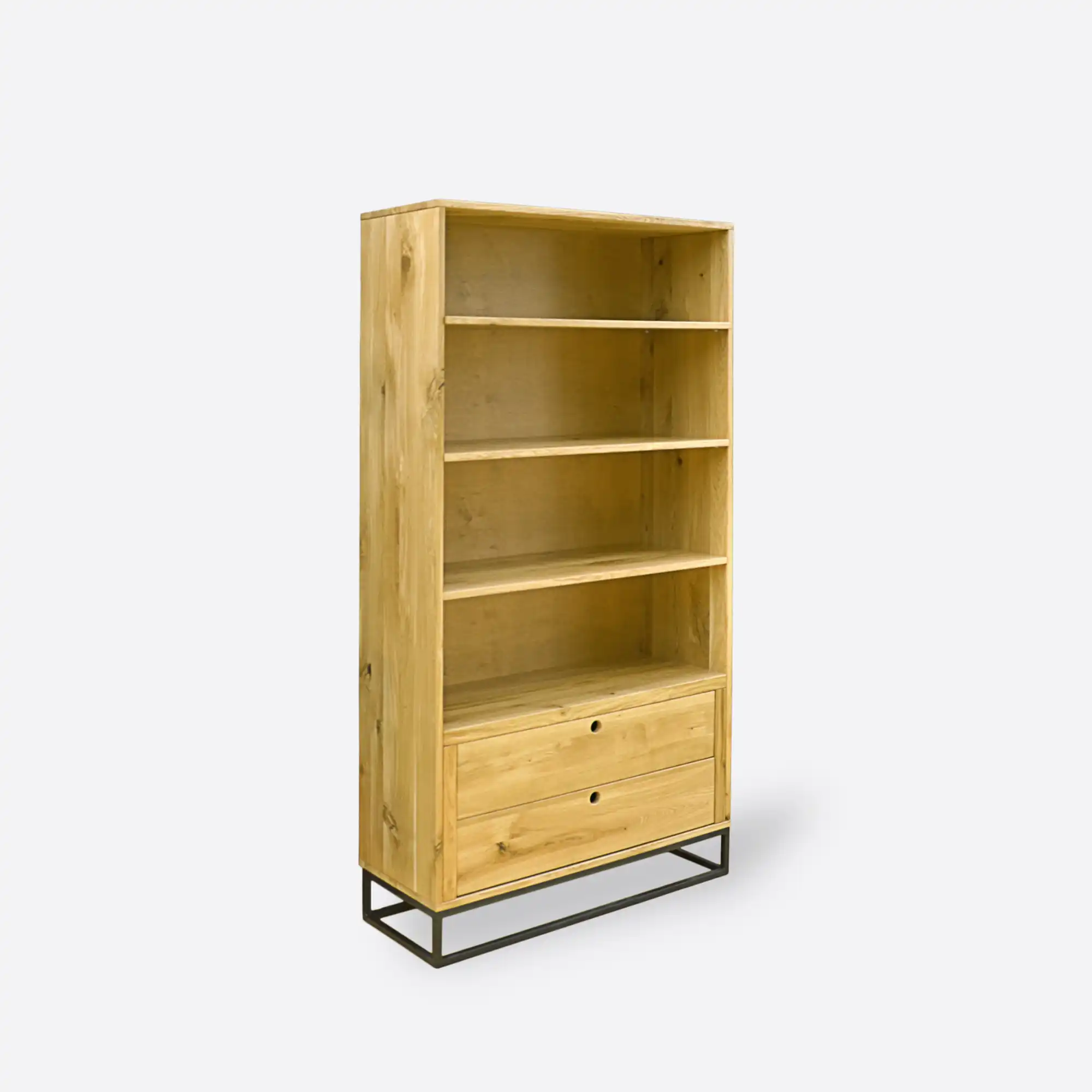 Regał dębowy na metalowych nogach MERIS to najnowsza propozycja w kolekcji mebli MERIS. Nowoczesny design łączy się tutaj z industrialnym stylem. Nowoczesny regał dębowa pozwoli na urządzenie salonu, jadalni jak również sypialni, czy nawet gabinetu. Drewniany regał wykonano z litego drewna dębowego o naturalnym kolorze. Drewniany regał to elegancki i szlachetny mebel, jej wygląd z pewnością zachwyci każdego. Drewniany regał posiada nogi wykonane ze stali malowanej proszkowo na kolor czarny. Trzy półki/cztery przestrzenie zapewnią wystarczająco dużo miejsca do wyeksponowania zdjęć, książek lub pamiątek, które chcielibyśmy mieć w zasięgu wzroku. Ponadto nasz drewniany regał posiada dwie pojemne szuflady, które zapewnią miejsce do schowania rzeczy, które chcielibyśmy ukryć. Loftowy regał dębowy na metalowych nogach MERIS to funkcjonalny i designerski mebel, który sprawdzi się znakomicie w jadalni, salonie, biurze i gabinecie. Nowoczesny design w Twoim zasięgu!