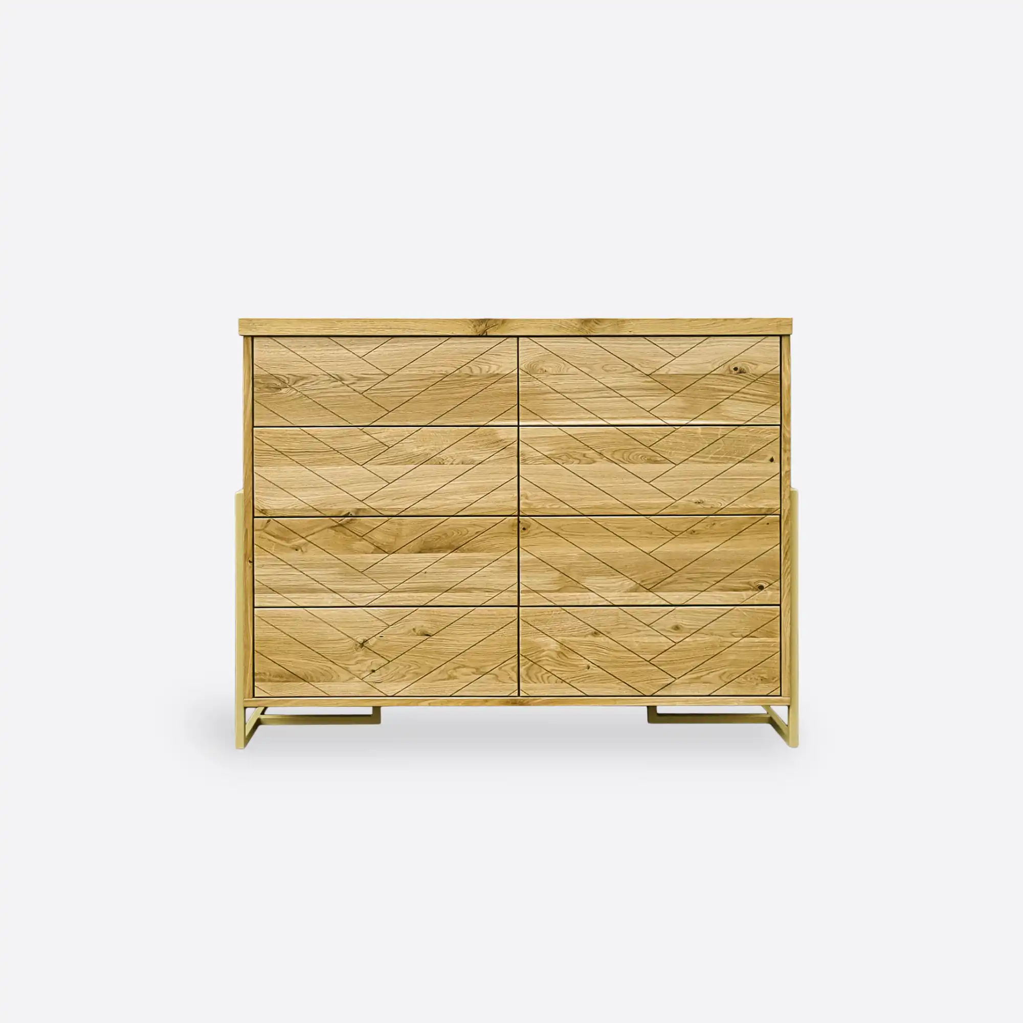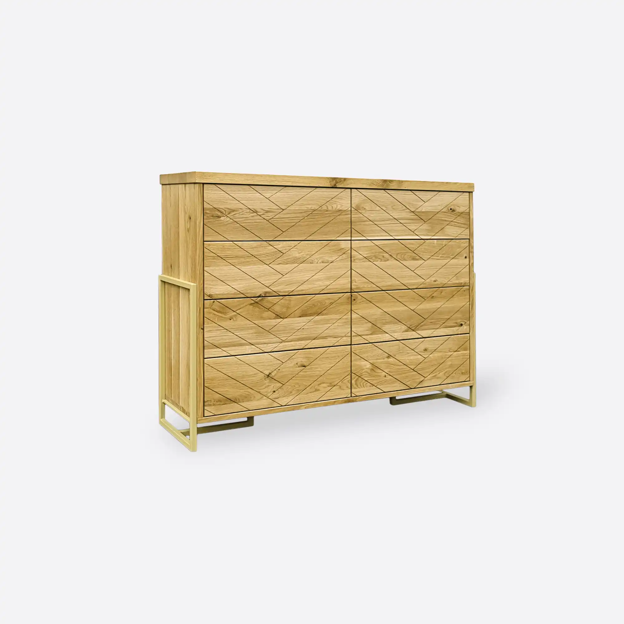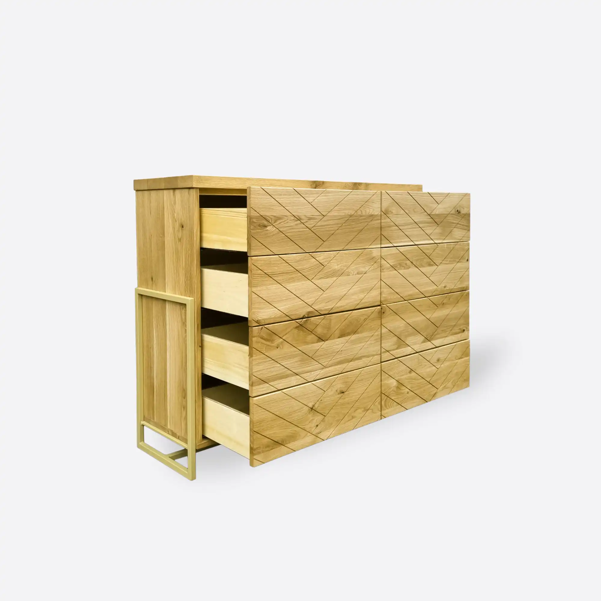 Mebel wykonano z naturalnego dębowego drewna litego, które jest solidne, trwałe i piękne. Natomiast nogi wykonano ze stali malowanej proszkowo na kolor złoty. Ciepła kolorystyka naturalnego dębu doskonale komponuje się ze złotymi stalowymi elementami. Oczywiście istnieje możliwość zmiany koloru drewna oraz stali. Designerska dębowa komoda wyposażona w aż osiem szuflad jest niezwykle praktyczna i pojemna. Prosta forma wsparta na metalowych nóżkach świetnie wpisuje się w styl industrialny oraz skandynawski. Nowoczesna komoda dębowa z szufladami CARIN I będzie doskonale pasowała do sypialni, jak również salonu, dodając tym pomieszczeniom charakteru.