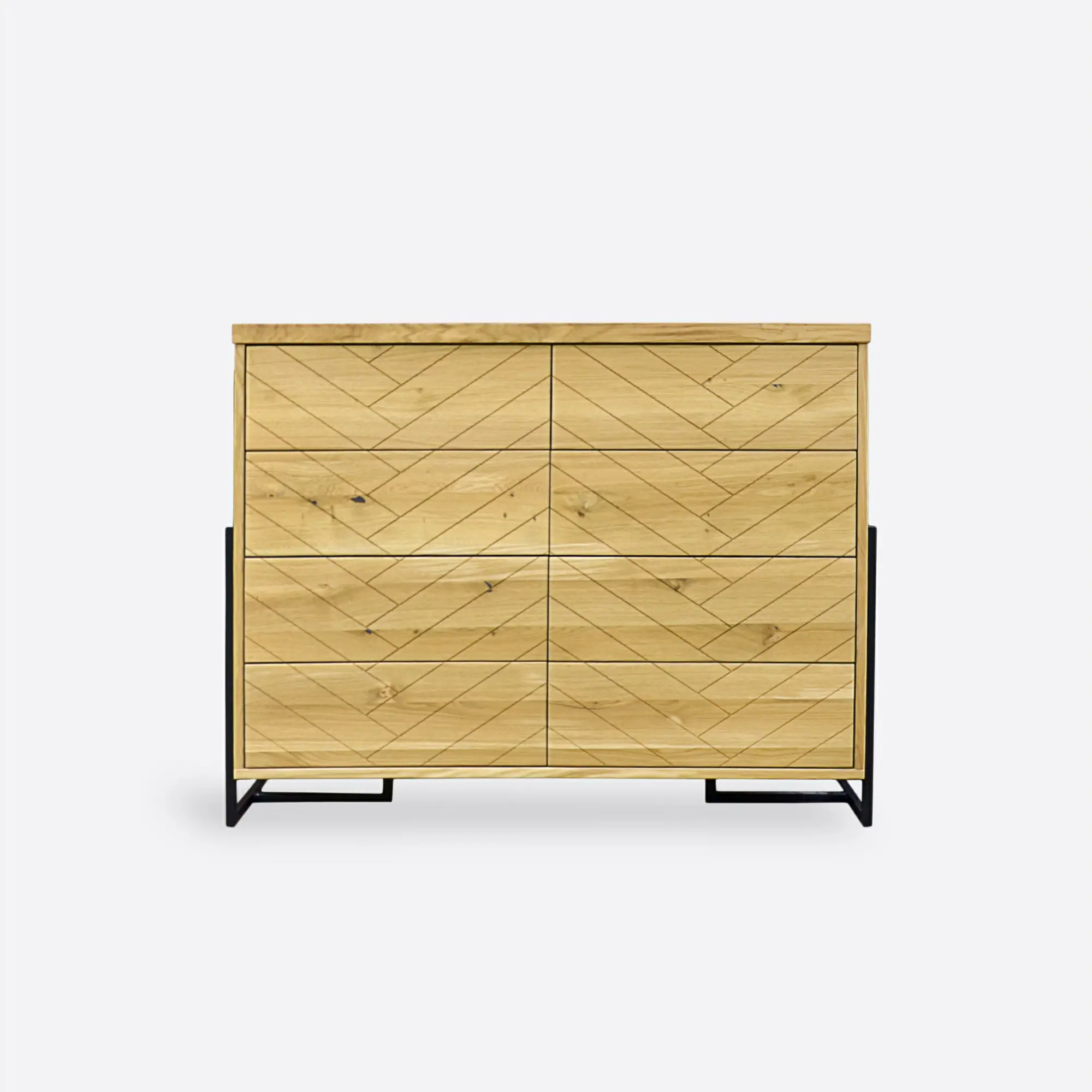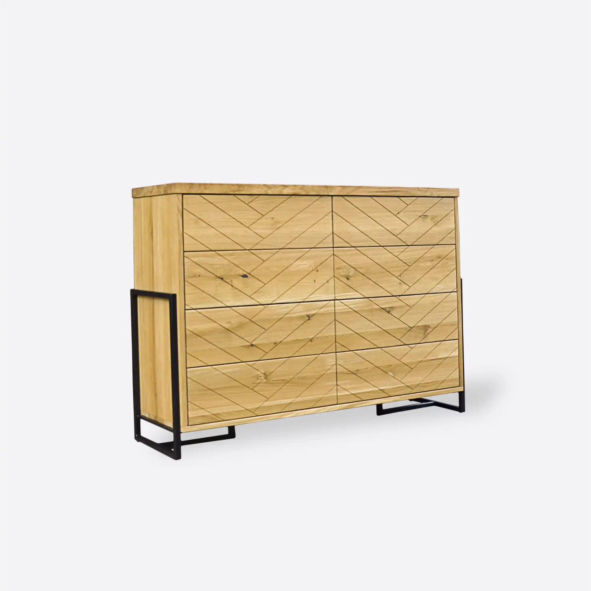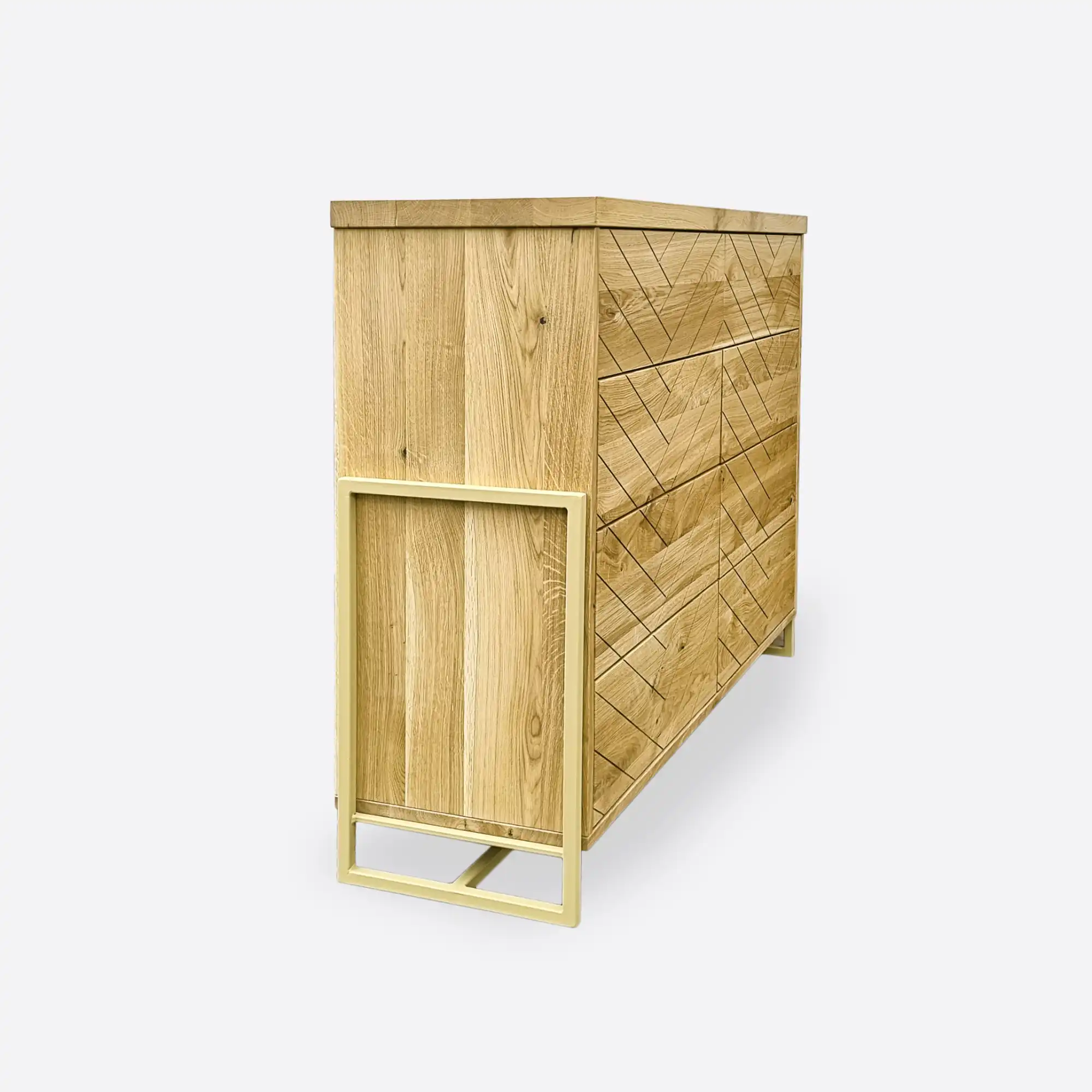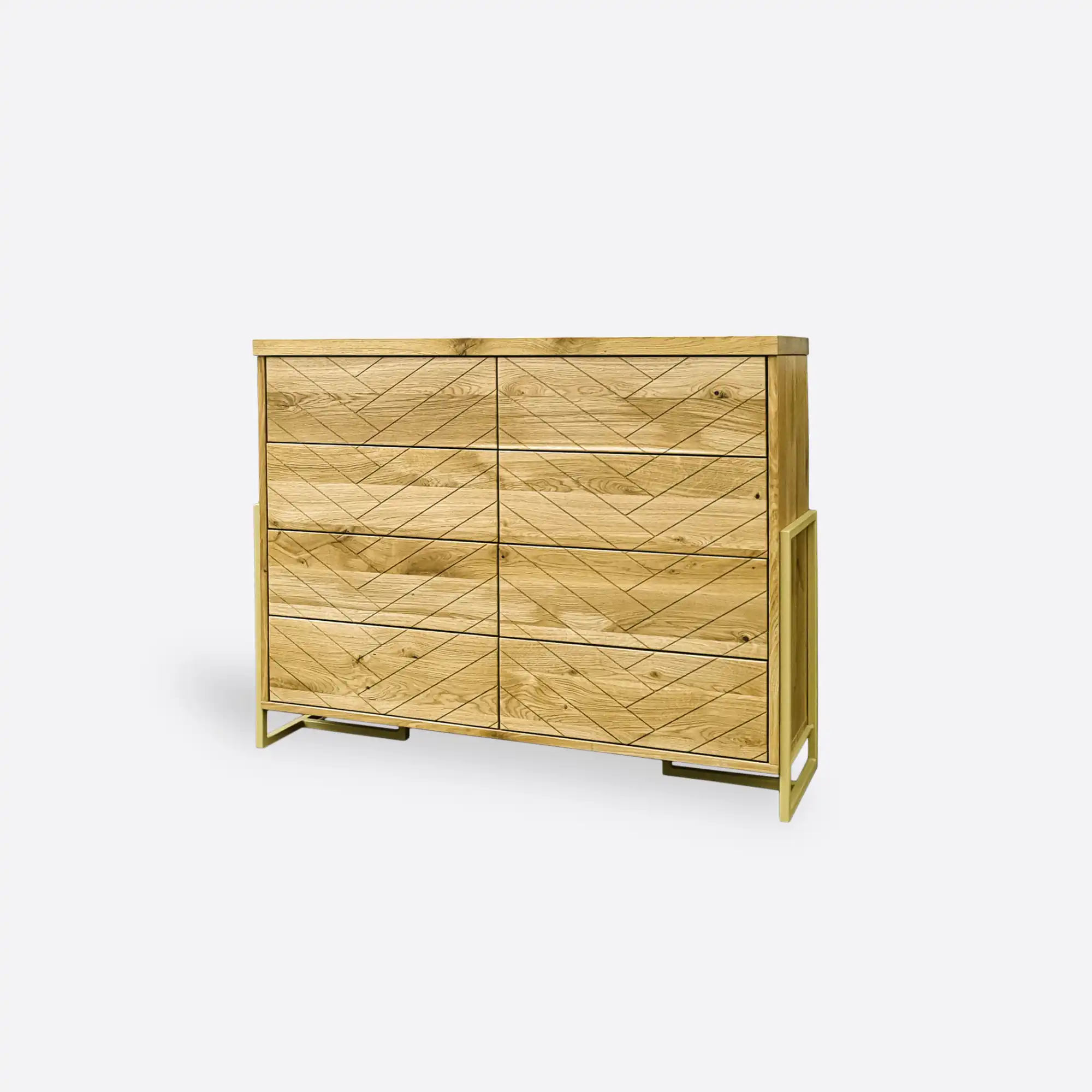 Mebel wykonano z naturalnego dębowego drewna litego, które jest solidne, trwałe i piękne. Natomiast nogi wykonano ze stali malowanej proszkowo na kolor złoty. Ciepła kolorystyka naturalnego dębu doskonale komponuje się ze złotymi stalowymi elementami. Oczywiście istnieje możliwość zmiany koloru drewna oraz stali. Designerska dębowa komoda wyposażona w aż osiem szuflad jest niezwykle praktyczna i pojemna. Prosta forma wsparta na metalowych nóżkach świetnie wpisuje się w styl industrialny oraz skandynawski. Nowoczesna komoda dębowa z szufladami CARIN I będzie doskonale pasowała do sypialni, jak również salonu, dodając tym pomieszczeniom charakteru.