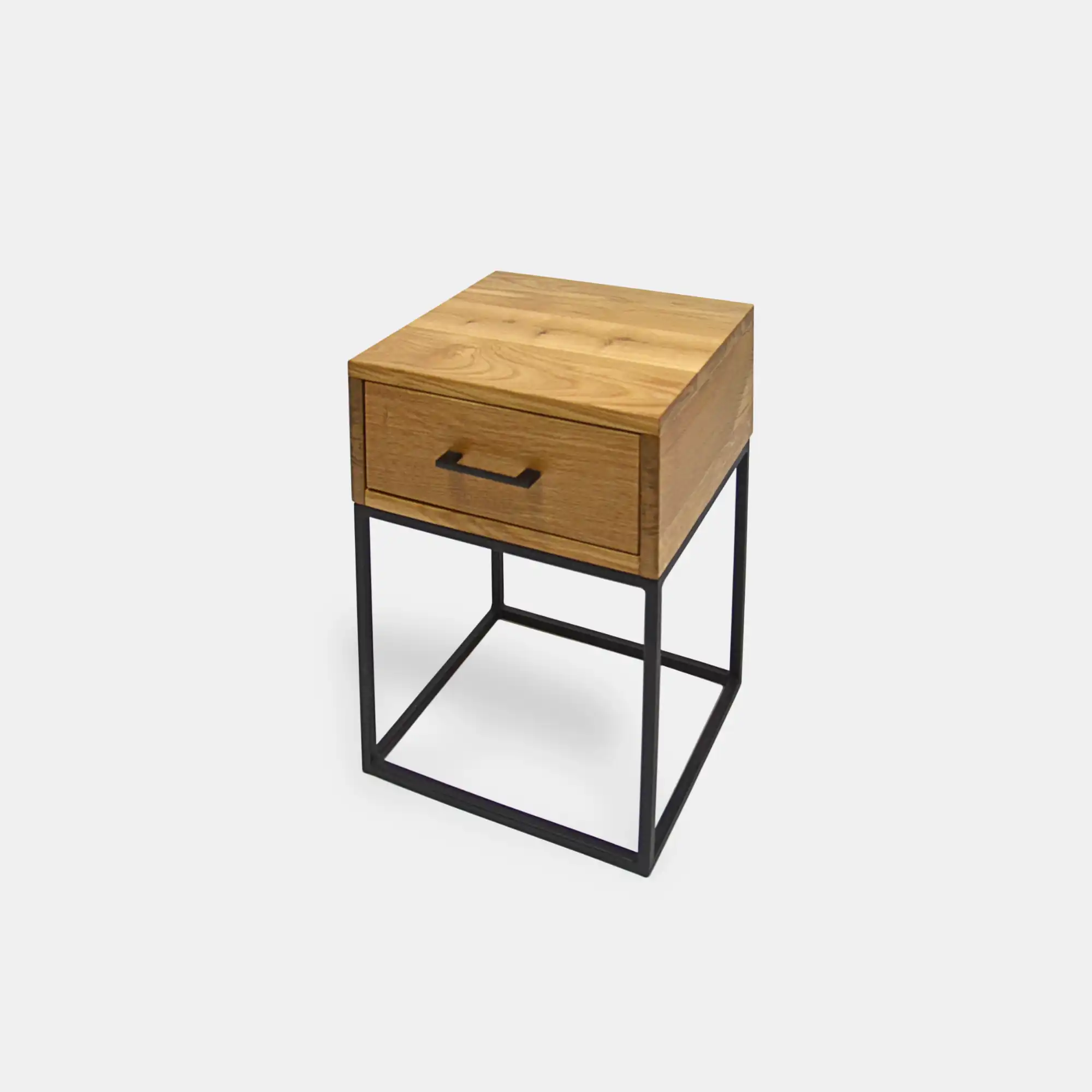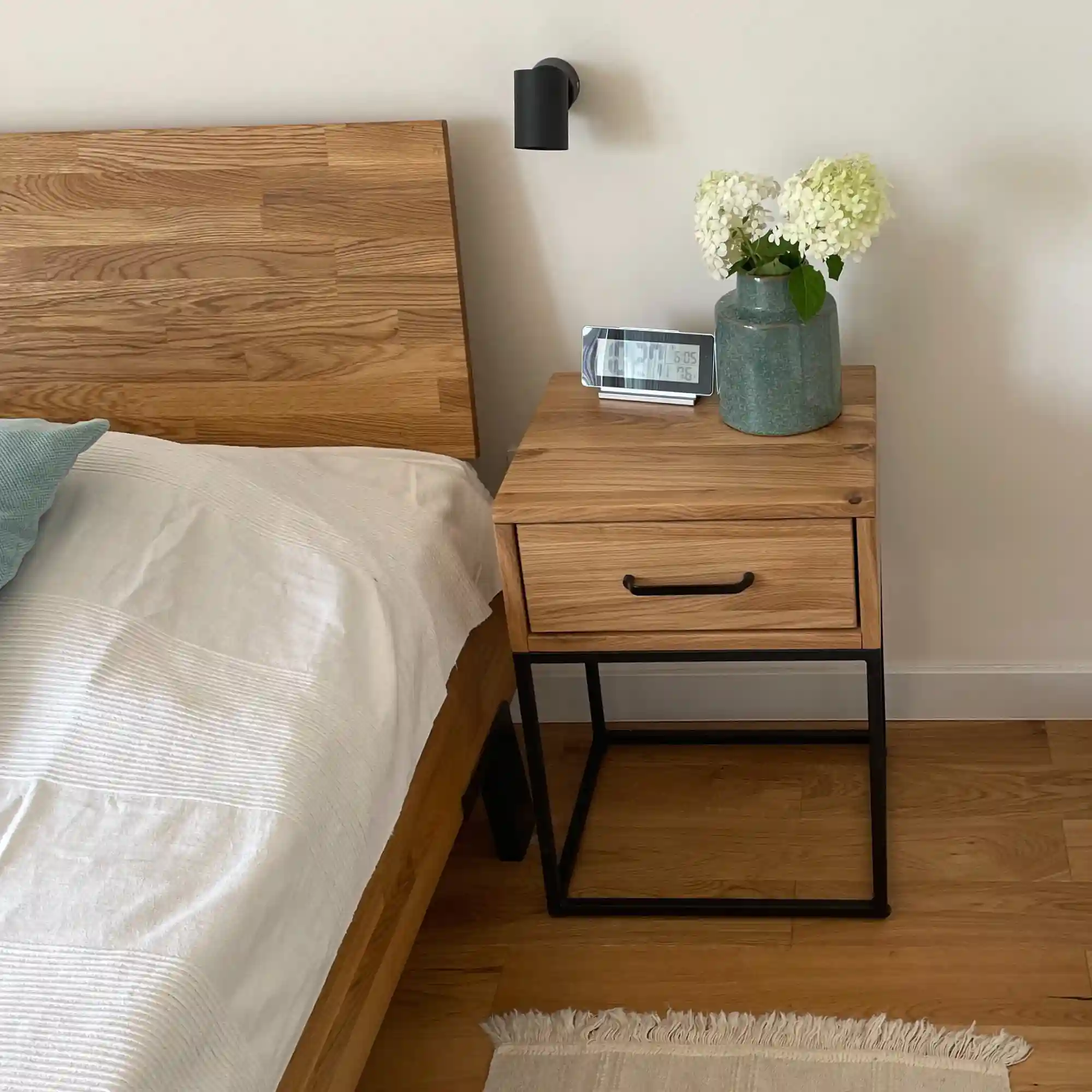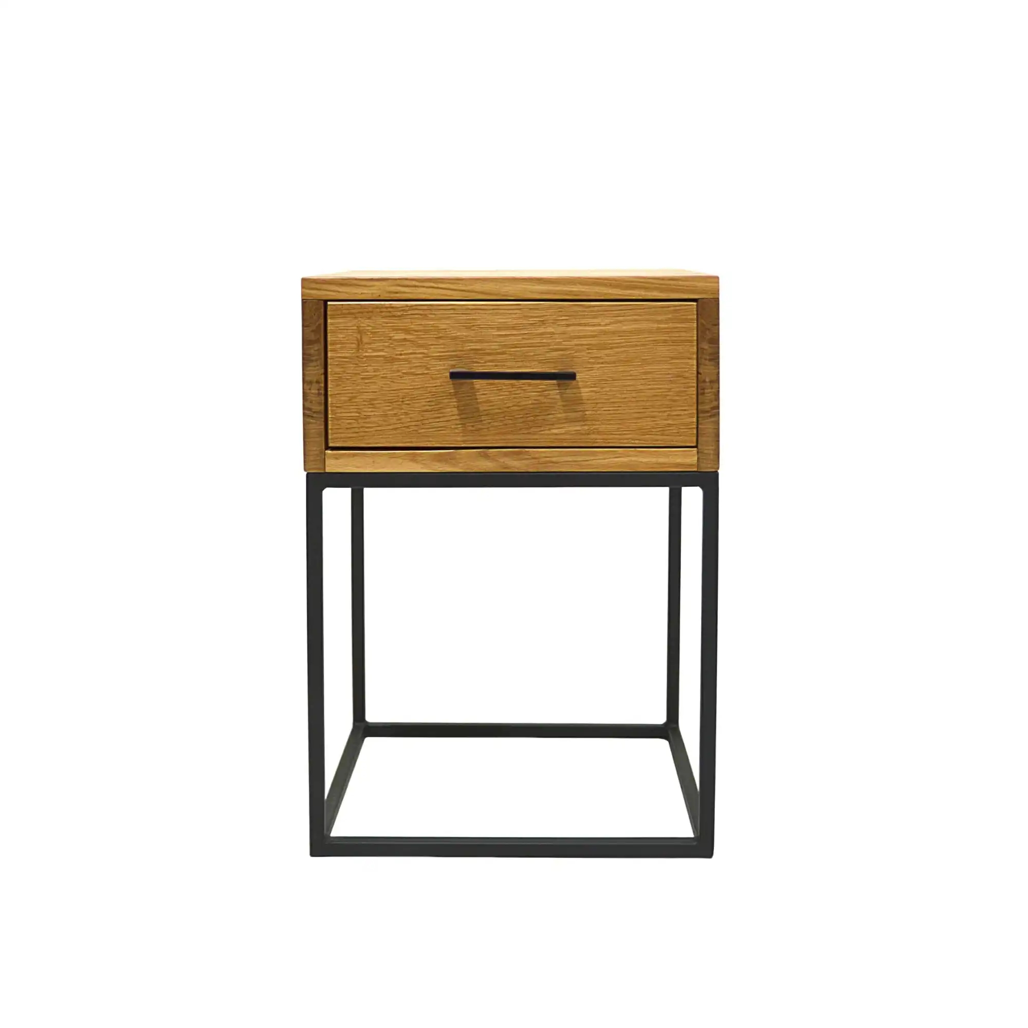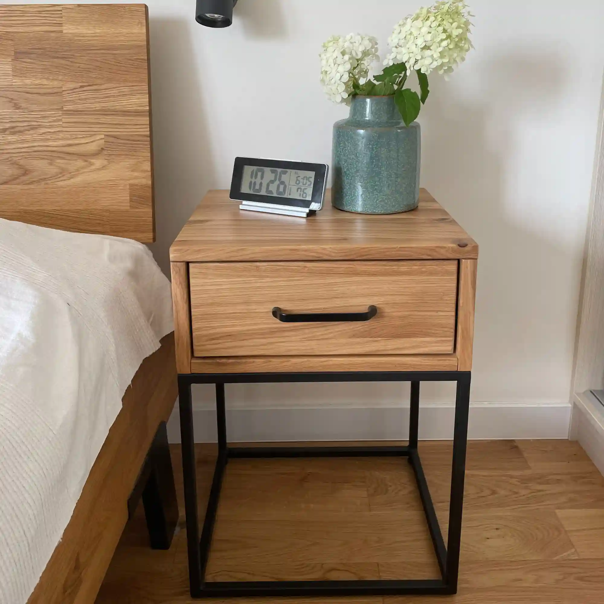 Szafka nocna z litego drewna i metalu jest solidna i masywna, a zarazem wygląda lekko i zgrabnie. Co wyróżnia naszą szafkę nocną? Szafka nocna industrialna jest ręczne wykonana z solidnego naturalnego dębowego drewna litego. Natomiast podstawę wykonano ze stali malowanej proszkowo. Malowanie proszkowe wygląda doskonale, a do tego bardzo dobrze zabezpiecza stal. Drewniana szafka nocna w stylu loft posiada szufladę, która zapewni miejsce na ukrycie rzeczy, które musisz mieć pod ręką w sypialni. Szafka nocna z litego drewna i metalu będzie z pewnością doskonale pasowała do wnętrz w stylu industrialnym, jak również nowoczesnym i klasycznym. Sprawdź pozostałe meble w stylu loft z serii MERIS.