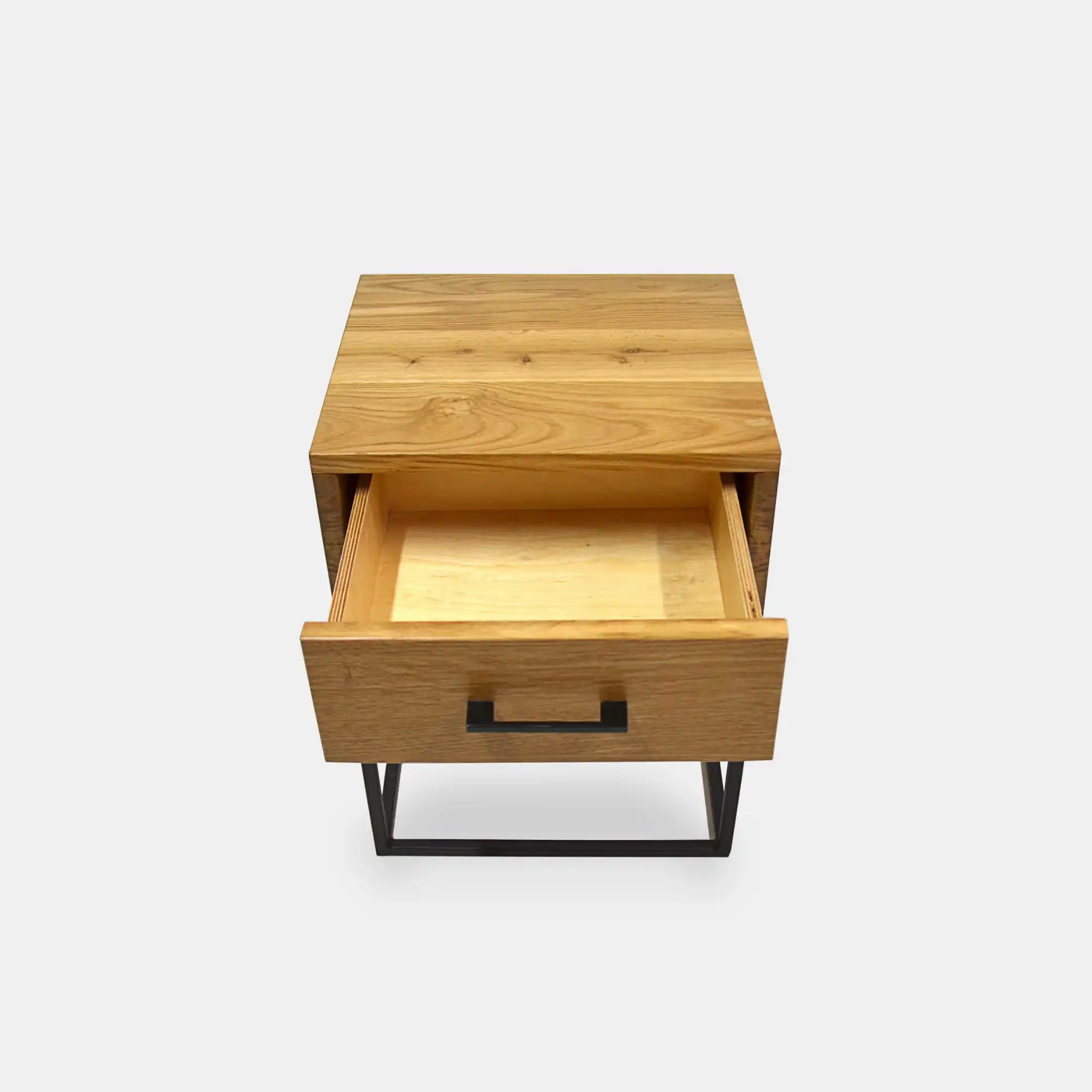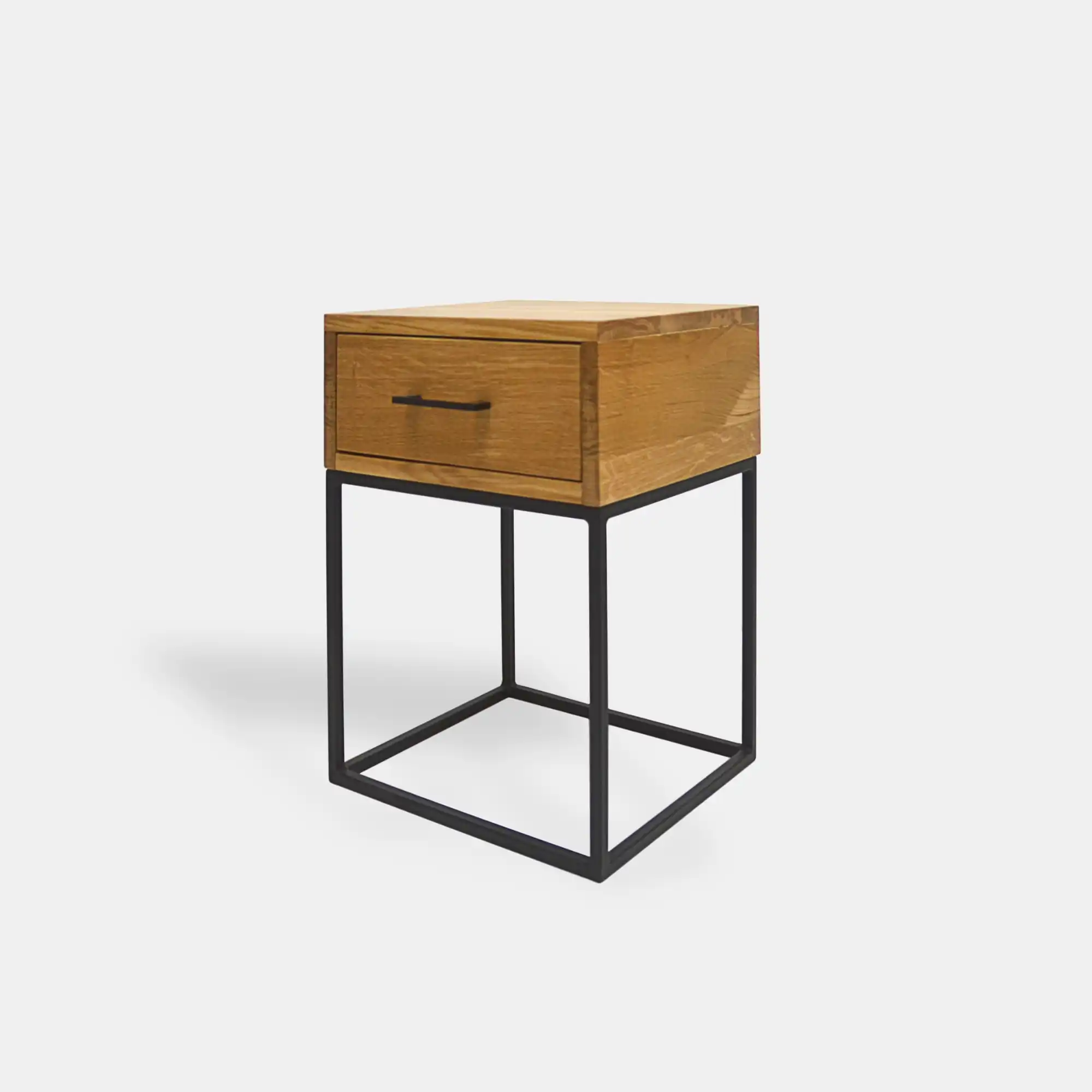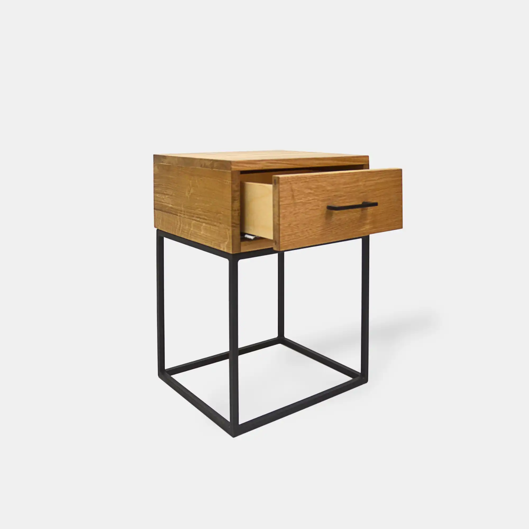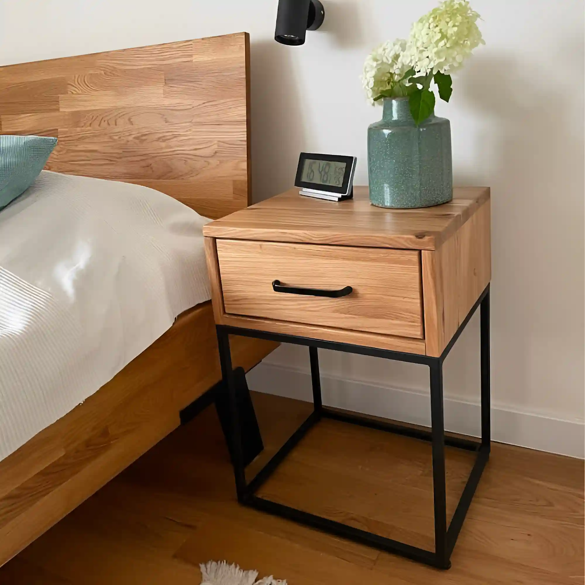 Szafka nocna z litego drewna i metalu jest solidna i masywna, a zarazem wygląda lekko i zgrabnie. Co wyróżnia naszą szafkę nocną? Szafka nocna industrialna jest ręczne wykonana z solidnego naturalnego dębowego drewna litego. Natomiast podstawę wykonano ze stali malowanej proszkowo. Malowanie proszkowe wygląda doskonale, a do tego bardzo dobrze zabezpiecza stal. Drewniana szafka nocna w stylu loft posiada szufladę, która zapewni miejsce na ukrycie rzeczy, które musisz mieć pod ręką w sypialni. Szafka nocna z litego drewna i metalu będzie z pewnością doskonale pasowała do wnętrz w stylu industrialnym, jak również nowoczesnym i klasycznym. Sprawdź pozostałe meble w stylu loft z serii MERIS.